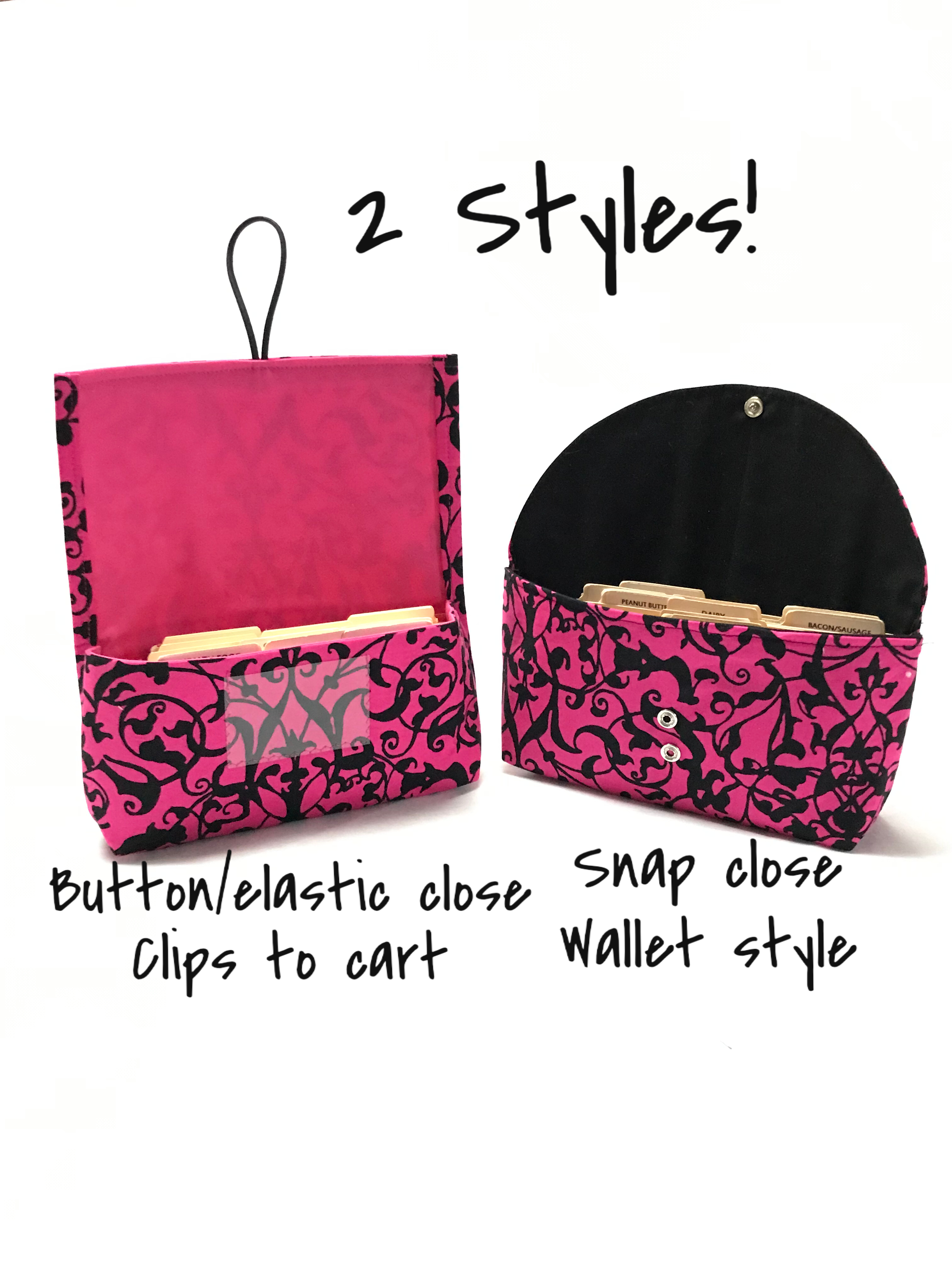 Button/Elastic - this style allows you to clip the organizer onto your grocery cart if you want and also has a small vinyl window for your contact info (people have been known to forget to unclip them!)