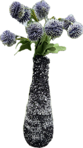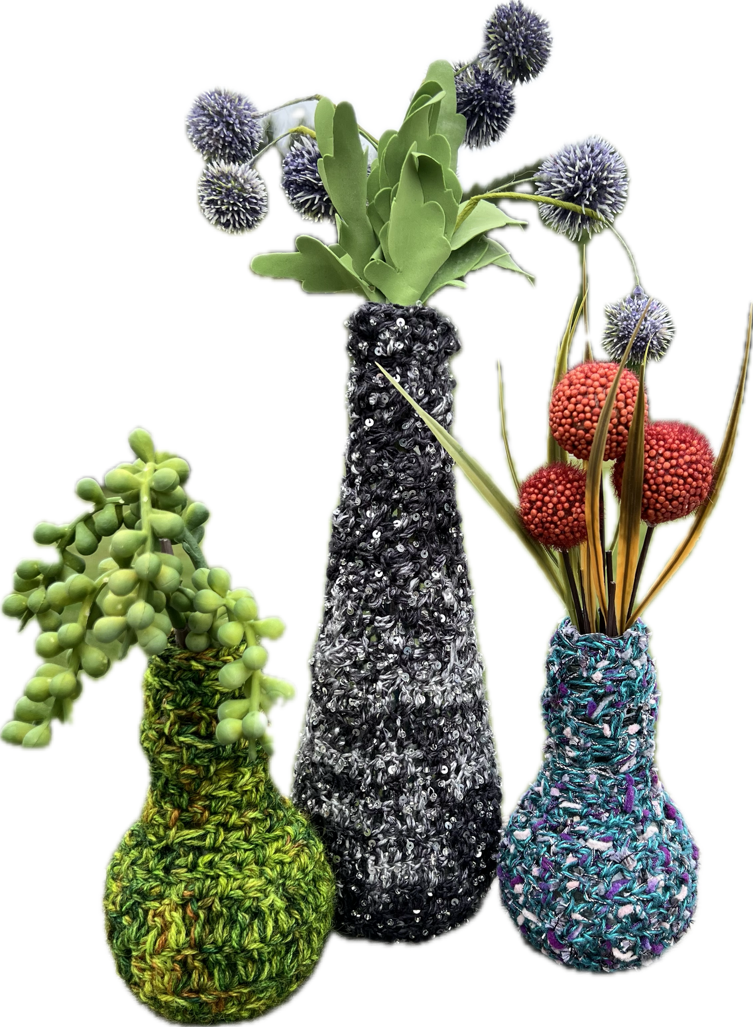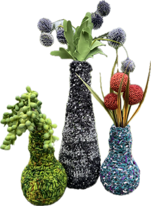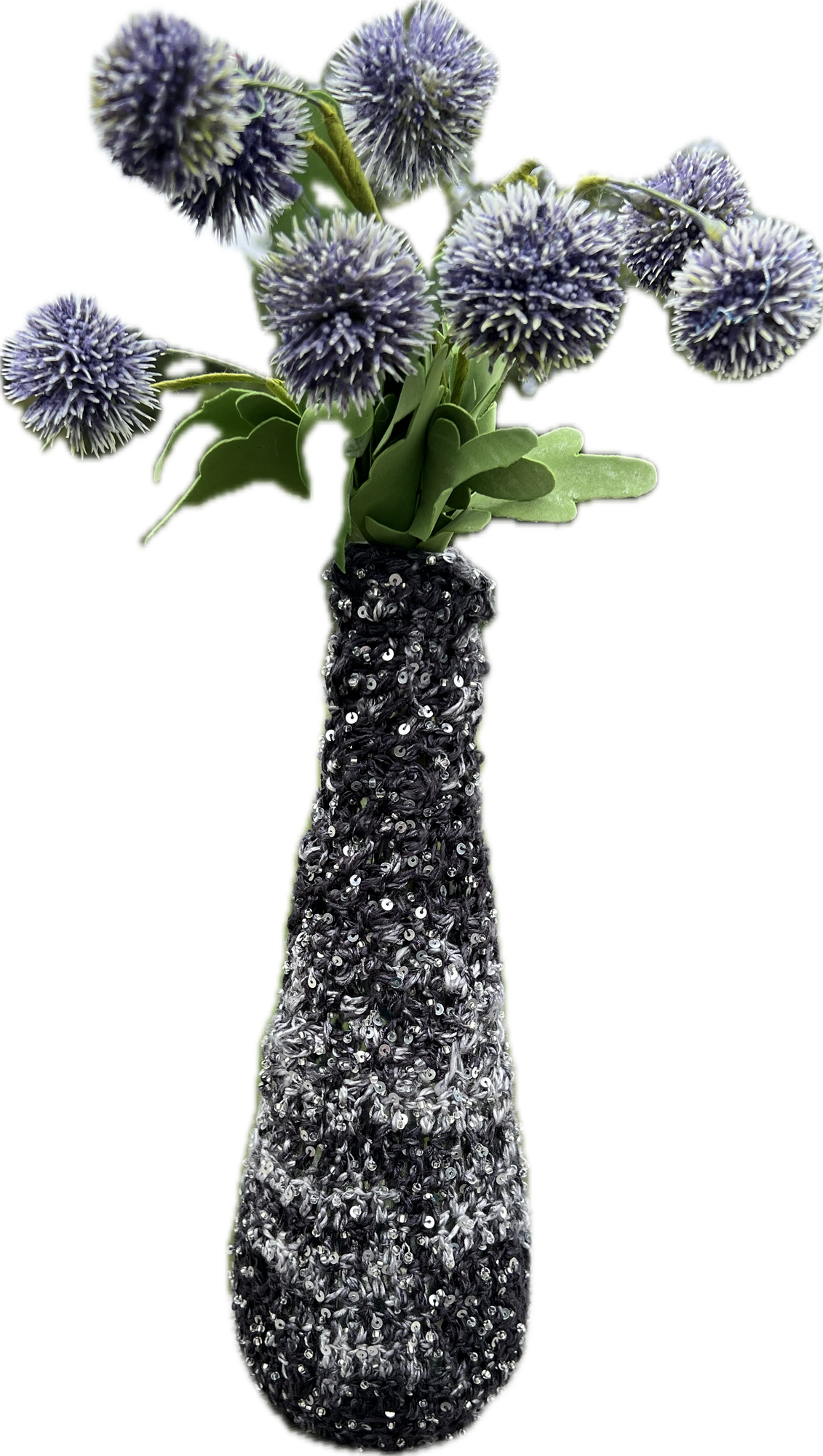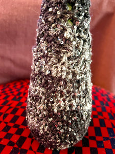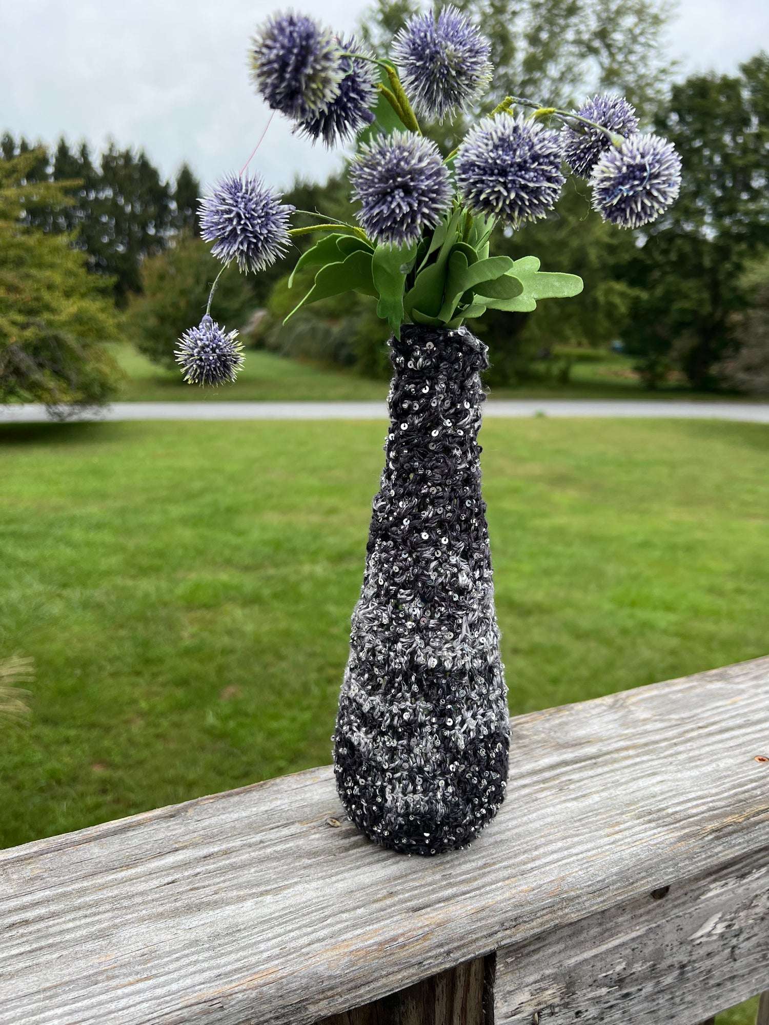 I use assorted yarns to give each vase a multi colored mottled look. Great way to use up fun novelty yarns I've saved. This one uses some cool novelty yarn that includes silver sequins and clear glass beads. Shimmers a bit in the right light!